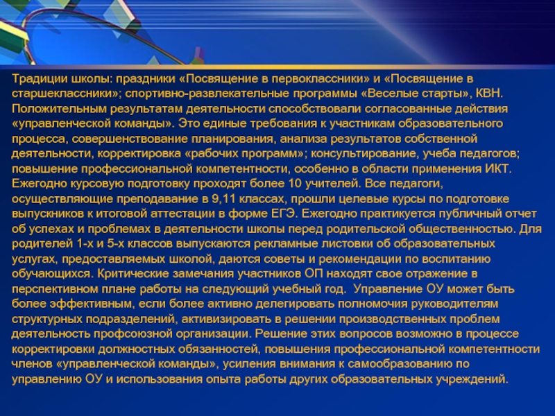 программы «Веселые старты», КВН. Положительным результатам деятельности способствовали согласованные действия «управленческой команды». Это единые требования к участникам образовательного процесса, совершенствование планирования, анализа результатов собственной деятельности, корректировка «рабочих программ»; консультирование, учеба педагогов; повышение профессиональной компетентности, особенно в области применения ИКТ. Ежегодно курсовую подготовку проходят более 10 учителей. Все педагоги, осуществляющие преподавание в 9,11 классах, прошли целевые курсы по подготовке выпускников к итоговой аттестации в форме ЕГЭ. Ежегодно практикуется публичный отчет об успехах и проблемах в деятельности школы перед родительской общественностью. Для родителей 1-х и 5-х классов выпускаются рекламные листовки об образовательных услугах, предоставляемых школой, даются советы и рекомендации по воспитанию обучающихся. Критические замечания участников ОП находят свое отражение в перспективном плане работы на следующий учебный год. Управление ОУ может быть более эффективным, если более активно делегировать полномочия руководителям структурных подразделений, активизировать в решении производственных проблем деятельность профсоюзной организации. Решение этих вопросов возможно в процессе корректировки должностных обязанностей, повышения профессиональной компетентности членов «управленческой команды», усиления внимания к самообразованию по управлению ОУ и использования опыта работы других образовательных учреждений.
