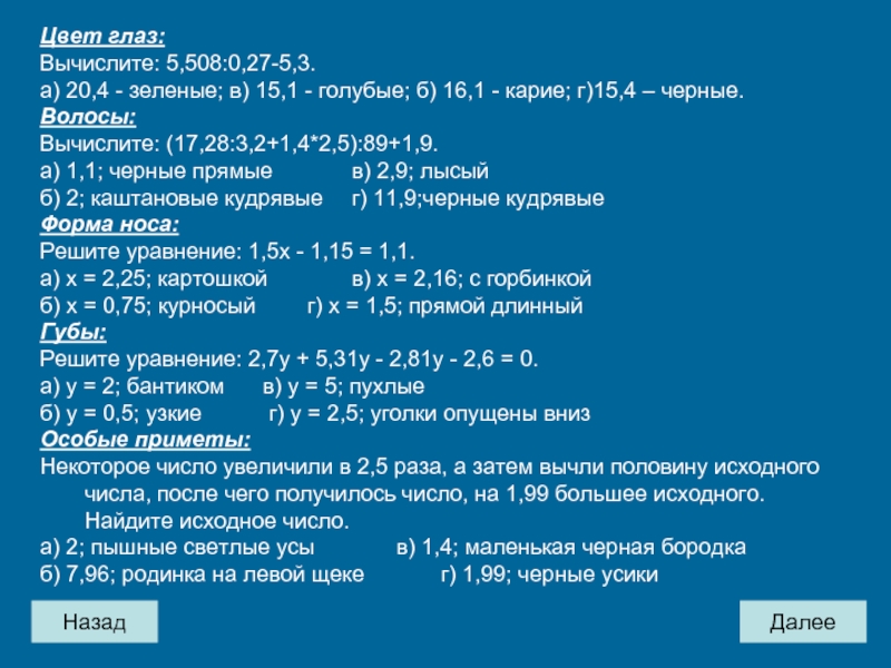 б) 7,96; родинка на левой щеке		г) 1,99; черные усики