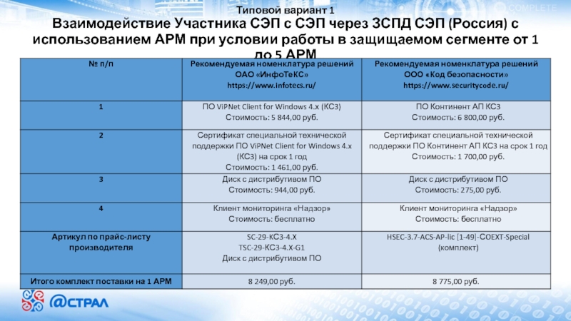 с использованием АРМ при условии работы в защищаемом сегменте от 1 до 5 АРМ