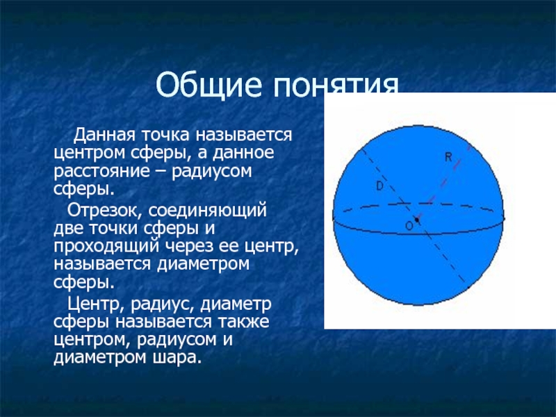 Центр, радиус, диаметр сферы называется также центром, радиусом и диаметром шара.