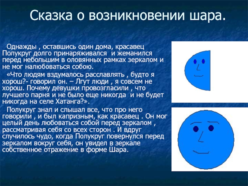 Полукруг знал и слышал все, что про него говорили , и был капризным, как красавец . Он мог целый день любоваться собой перед зеркалом , рассматривая себя со всех сторон . И вдруг случилось чудо, когда Полукруг повернулся перед зеркалом вокруг себя, он увидел в зеркале собственное отражение в форме Шара.