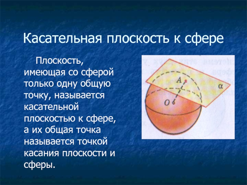 только одну общую точку, называется касательной плоскостью к сфере, а их общая точка называется точкой касания плоскости и сферы.