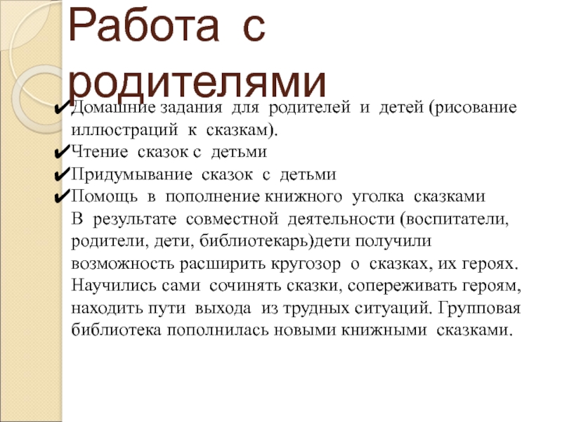В результате совместной деятельности (воспитатели,родители, дети, библиотекарь)дети получили возможность расширить кругозор о сказках, их героях. Научились сами сочинять сказки, сопереживать героям, находить пути выхода из трудных ситуаций. Групповая библиотека пополнилась новыми книжными сказками.