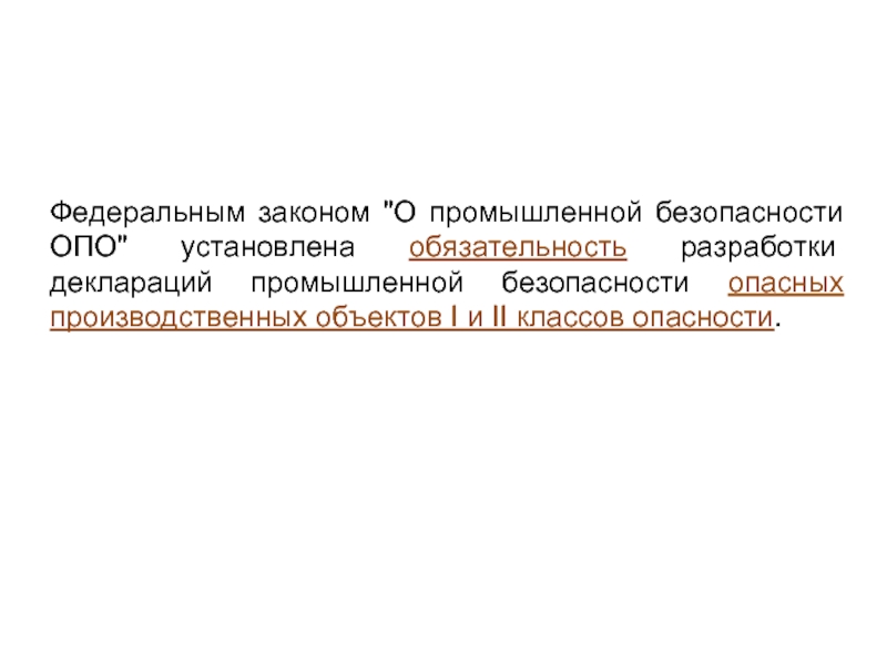Слайд 11Федеральным законом "О промышленной безопасности ОПО" установлена обязательность разработки деклараций промышленной