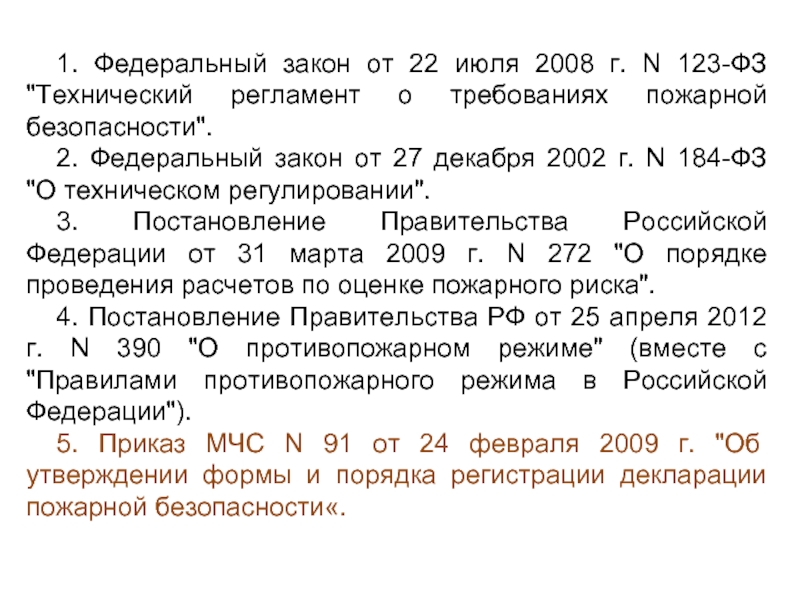 5. Приказ МЧС N 91 от 24 февраля 2009 г. "Об утверждении формы и порядка регистрации декларации пожарной безопасности«.