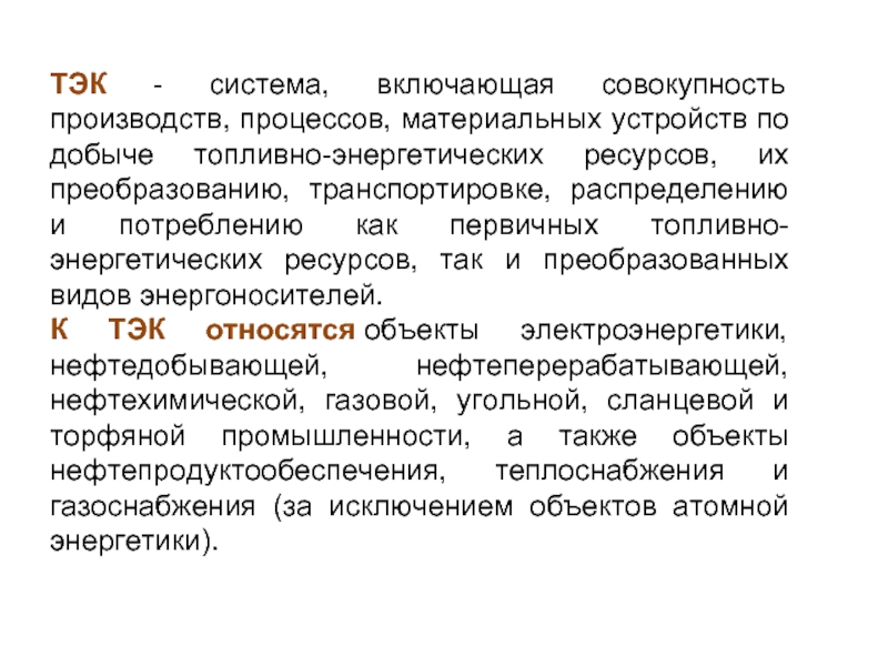К ТЭК относятся объекты электроэнергетики, нефтедобывающей, нефтеперерабатывающей, нефтехимической, газовой, угольной, сланцевой и торфяной промышленности, а также объекты нефтепродуктообеспечения, теплоснабжения и газоснабжения (за исключением объектов атомной энергетики).