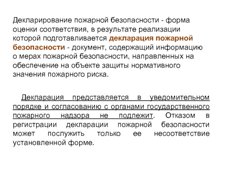 Слайд 2Декларирование пожарной безопасности - форма оценки соответствия, в результате реализации которой