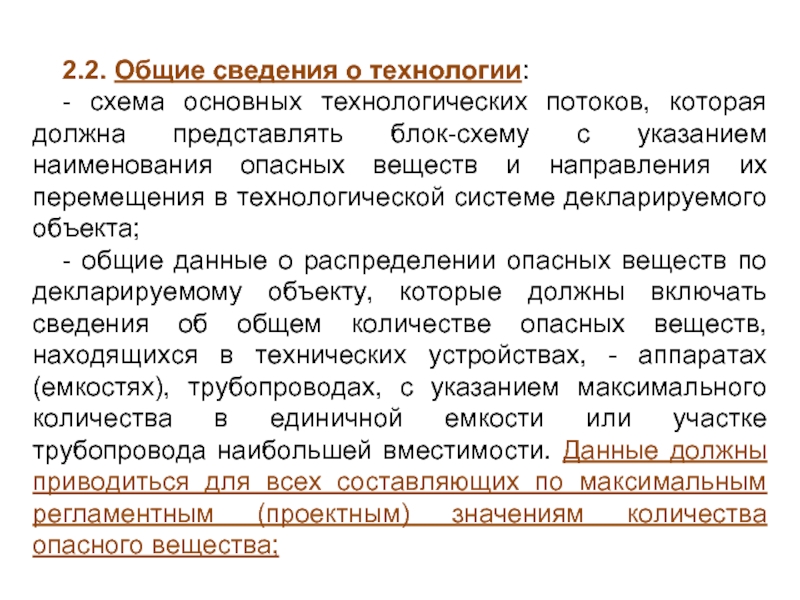 - общие данные о распределении опасных веществ по декларируемому объекту, которые должны включать сведения об общем количестве опасных веществ, находящихся в технических устройствах, - аппаратах (емкостях), трубопроводах, с указанием максимального количества в единичной емкости или участке трубопровода наибольшей вместимости. Данные должны приводиться для всех составляющих по максимальным регламентным (проектным) значениям количества опасного вещества;