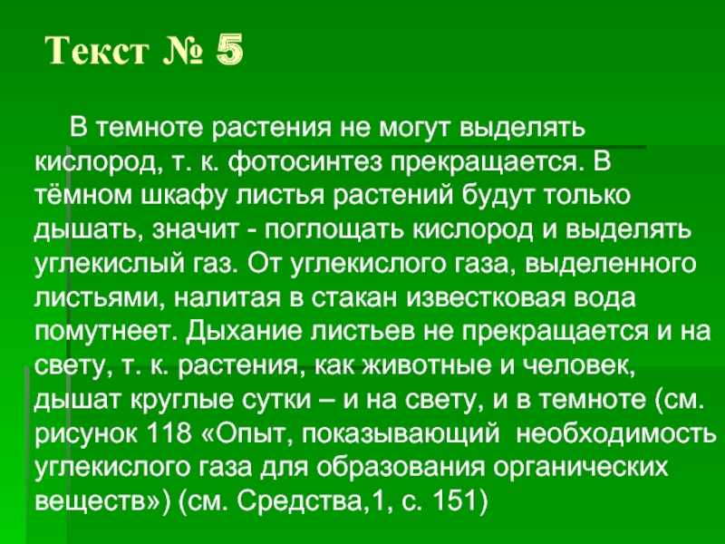не могут выделять кислород, т. к. фотосинтез прекращается. В тёмном шкафу листья растений будут только дышать, значит - поглощать кислород и выделять углекислый газ. От углекислого газа, выделенного листьями, налитая в стакан известковая вода помутнеет. Дыхание листьев не прекращается и на свету, т. к. растения, как животные и человек, дышат круглые сутки – и на свету, и в темноте (см. рисунок 118 «Опыт, показывающий необходимость углекислого газа для образования органических веществ») (см. Средства,1, с. 151)