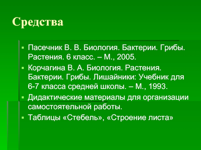 Корчагина В. А. Биология. Растения. Бактерии. Грибы. Лишайники: Учебник для 6-7 класса средней школы. – М., 1993.