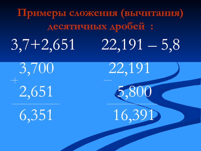 Слайд 8Примеры сложения (вычитания) десятичных дробей :