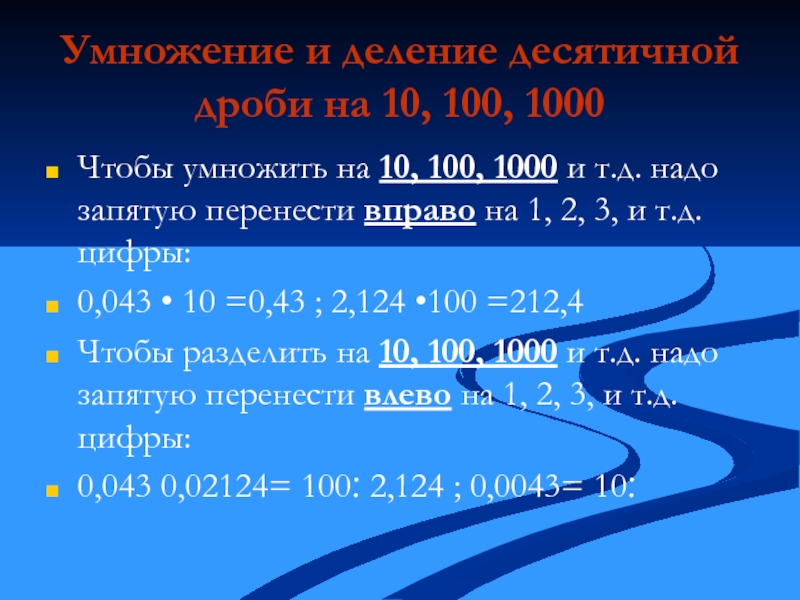 Слайд 9Умножение и деление десятичной дроби на 10, 100, 1000