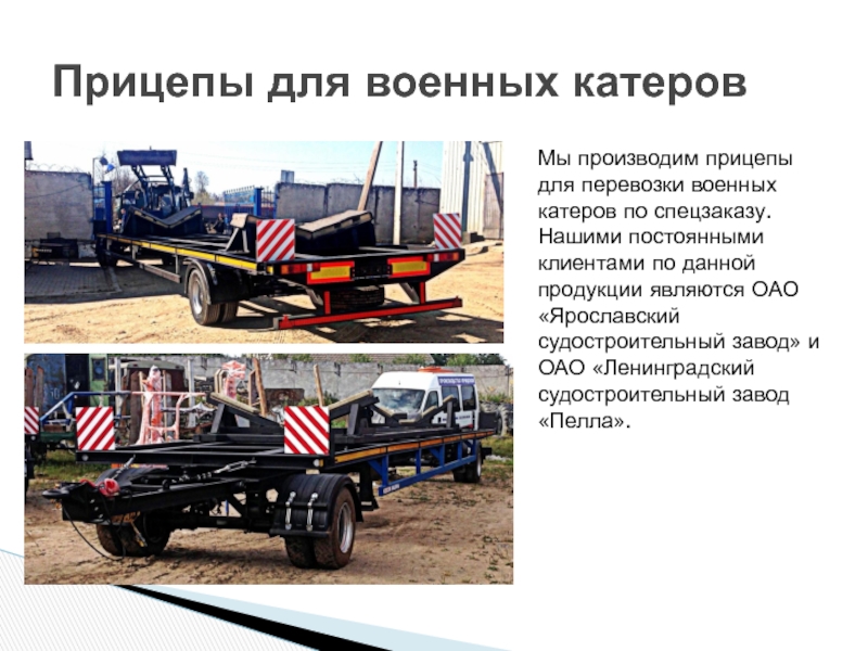 Основная продукция выпускаемая на нашем заводе это: низкорамные полуприцепы и прицепы, кабельные транспортеры, полуприцепы с отсоединяющимся гуськом и фронтальным заездом, шасси, контейнеровозы, бортовые прицепы и полуприцепы, а так же любые прицепы по индивидуальному заказу.
