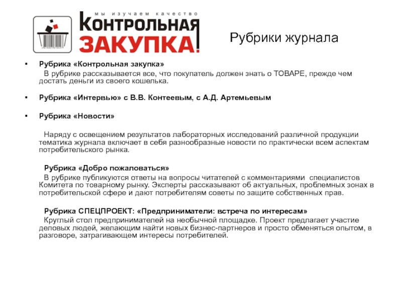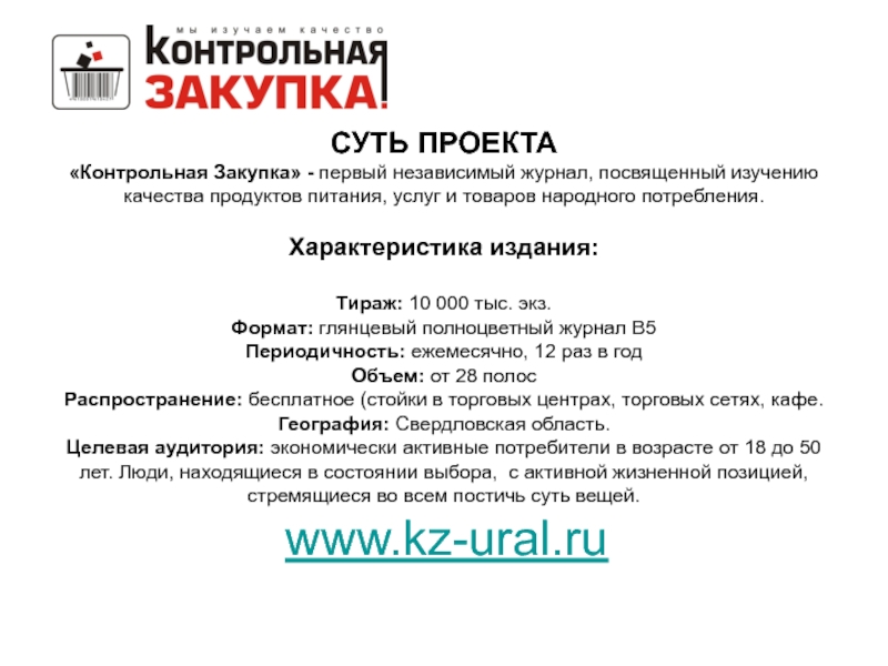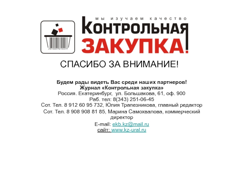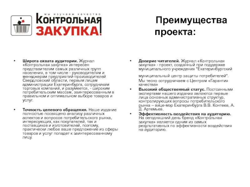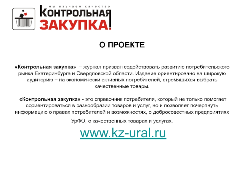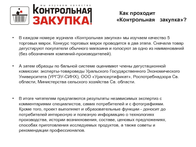 Доверие читателей. Журнал «Контрольная закупка» - проект, созданный при поддержке муниципального учреждения "Екатеринбургский муниципальный центр защиты потребителей". Мы тесно сотрудничаем с Центром «Гарантия качества»
