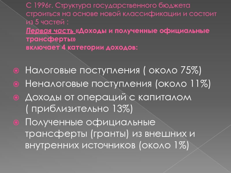 Полученные официальные трансферты (гранты) из внешних и внутренних источников (около 1%)