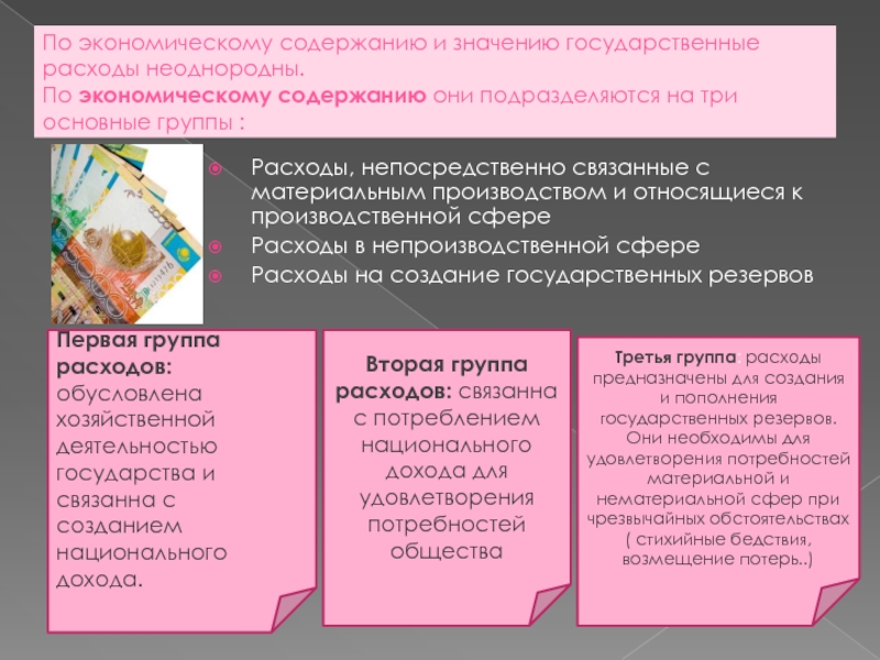 Первая группа расходов: обусловлена хозяйственной деятельностью государства и связанна с созданием национального дохода.