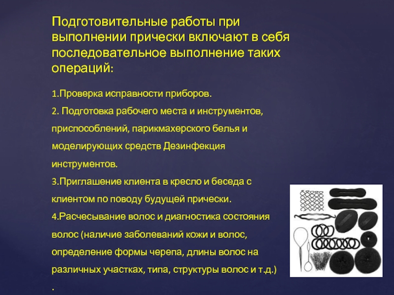 Слайд 2Подготовительные работы при выполнении прически включают в себя последовательное выполнение таких