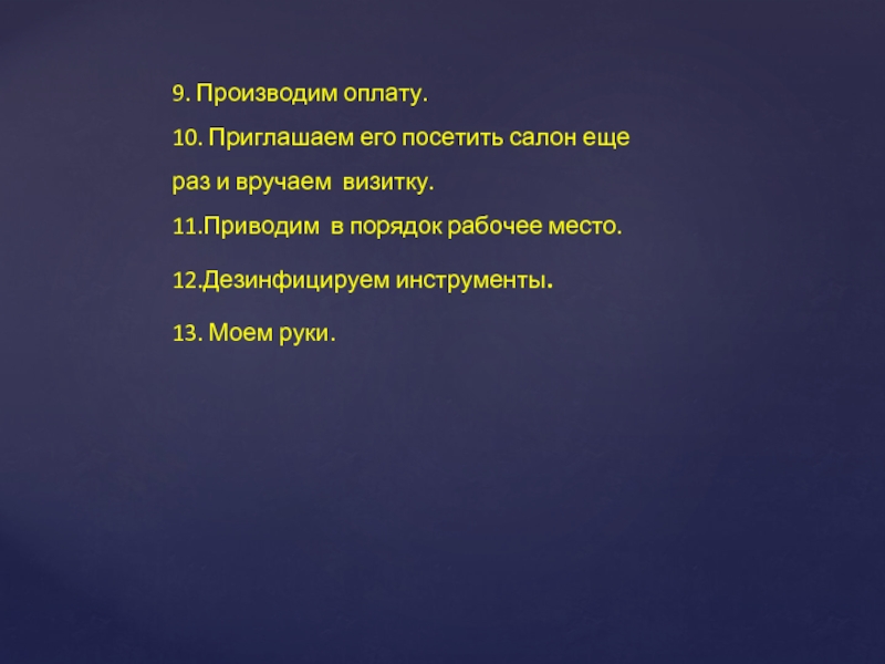 11.Приводим в порядок рабочее место. 12.Дезинфицируем инструменты.