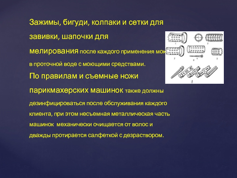 Слайд 12Зажимы, бигуди, колпаки и сетки для завивки, шапочки для мелирования после каждого