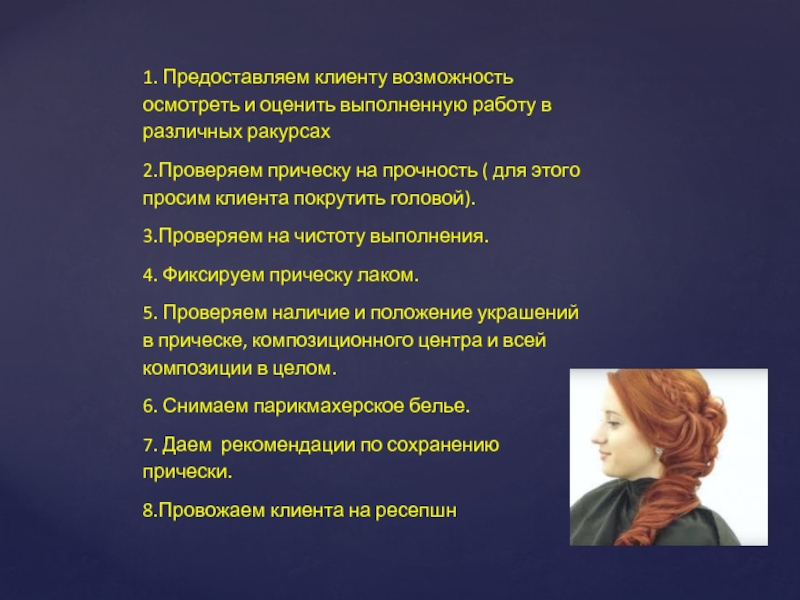8.Оказание дополнительной услуги при необходимости (мытье головы, стрижка лил окраска волос и т.д.)