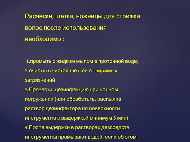 Слайд 11Расчески, щетки, ножницы для стрижки волос после использования необходимо ;