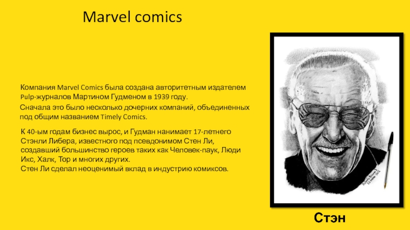 К 40-ым годам бизнес вырос, и Гудман нанимает 17-летнего Стэнли Либера, известного под псевдонимом Стен Ли, создавший большинство героев таких как Человек-паук, Люди Икс, Халк, Тор и многих других.