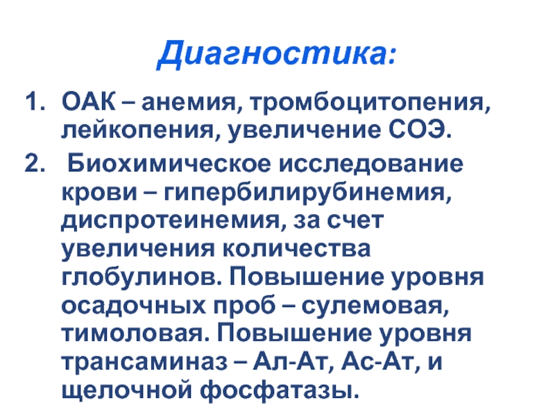 гипербилирубинемия, диспротеинемия, за счет увеличения количества глобулинов. Повышение уровня осадочных проб – сулемовая, тимоловая. Повышение уровня трансаминаз – Ал-Ат, Ас-Ат, и щелочной фосфатазы.
