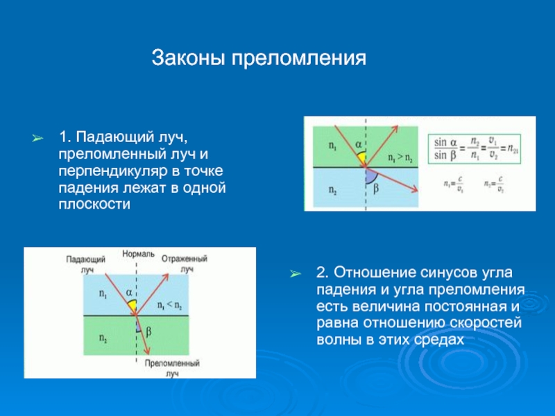 2. Отношение синусов угла падения и угла преломления есть величина постоянная и равна отношению скоростей волны в этих средах