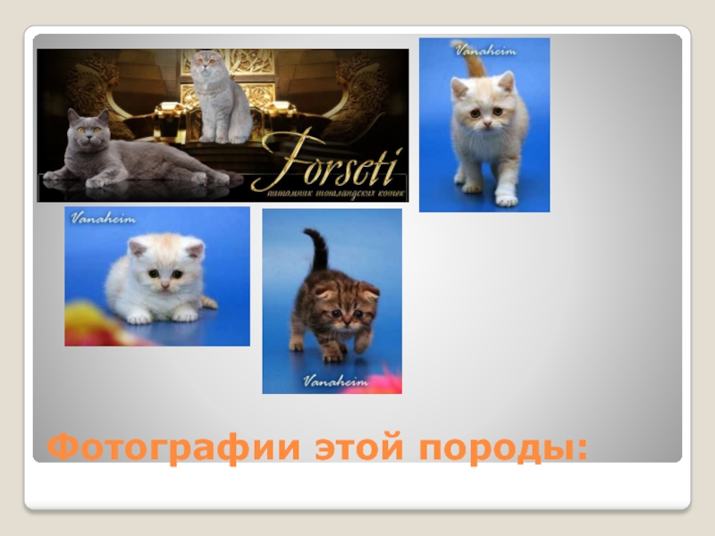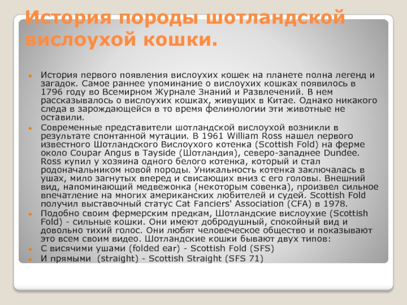 полна легенд и загадок. Самое раннее упоминание о вислоухих кошках появилось в 1796 году во Всемирном Журнале Знаний и Развлечений. В нем рассказывалось о вислоухих кошках, живущих в Китае. Однако никакого следа в зарождающейся в то время фелинологии эти животные не оставили.
