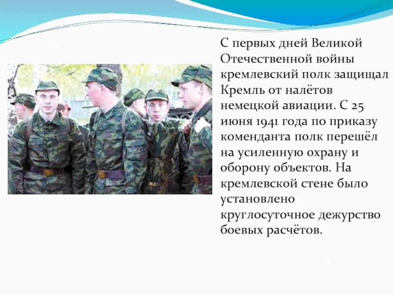 Слайд 6С первых дней Великой Отечественной войны кремлевский полк защищал Кремль от