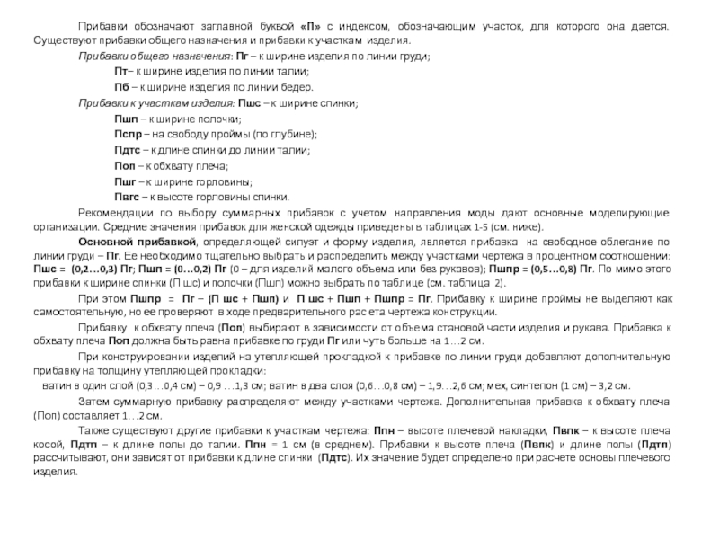 Затем суммарную прибавку распределяют между участками чертежа. Дополнительная прибавка к обхвату плеча (Поп) составляет 1…2 см.