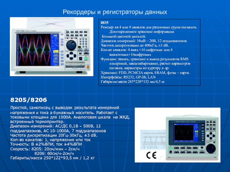 Рекодер с подключаемым принтером на 4 аналоговых и 8 цифровых каналов. Компактный 1,2 кг. Запись результатов на РС карту. Функция УЗО. Прибор непрерывной записи измерений с изменением скорости и времени хранения.