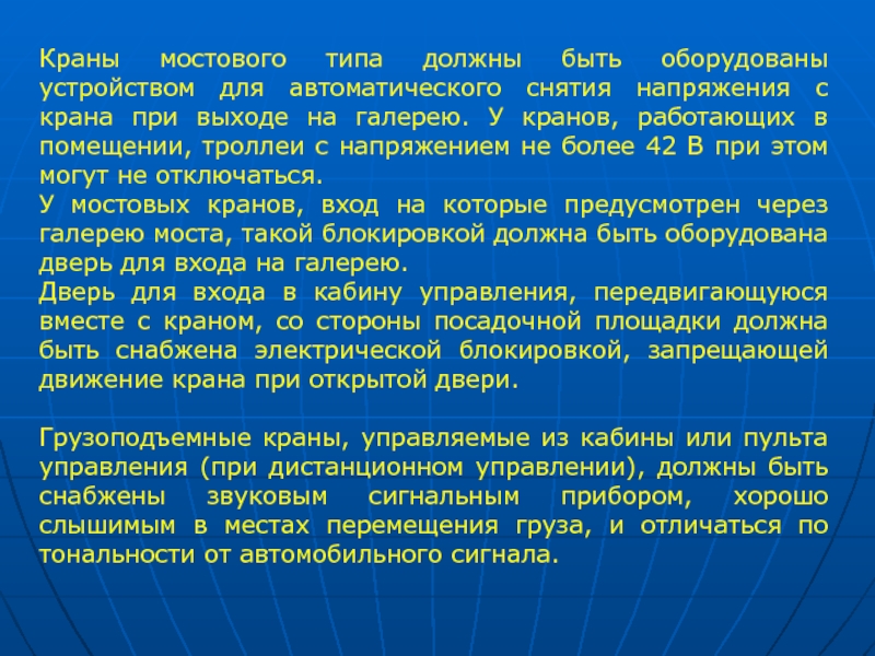 Слайд 7Краны мостового типа должны быть оборудованы устройством для автоматического снятия напряжения