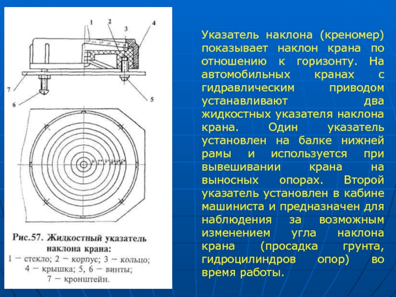 Слайд 32Указатель наклона (креномер) показывает наклон крана по отношению к горизонту. На