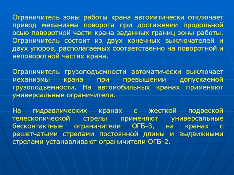 На гидравлических кранах с жесткой подвеской телескопической стрелы применяют универсальные бесконтактные ограничители ОГБ-3, на кранах с решетчатыми стрелами постоянной длины и выдвижными стрелами устанавливают ограничители ОГБ-2.