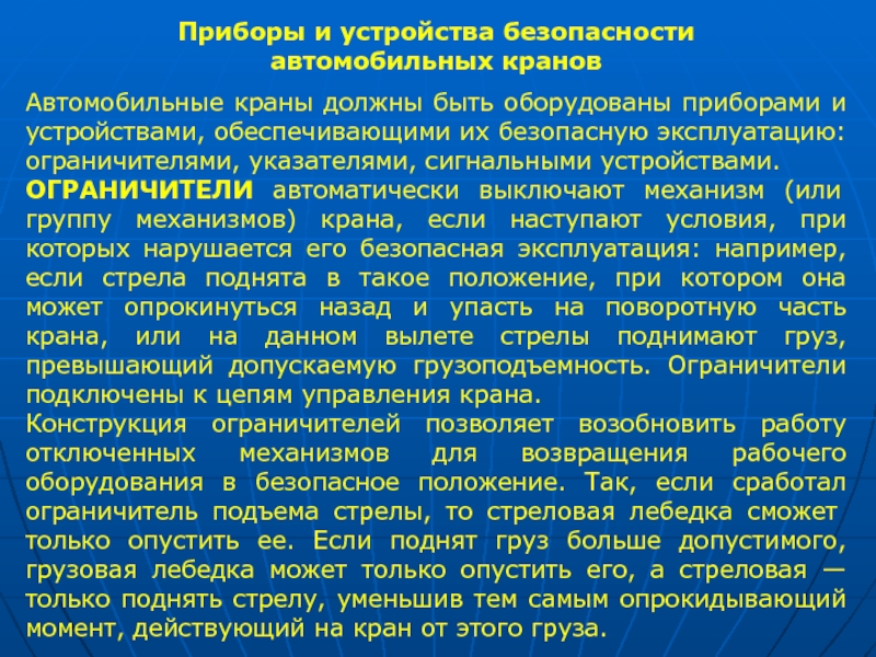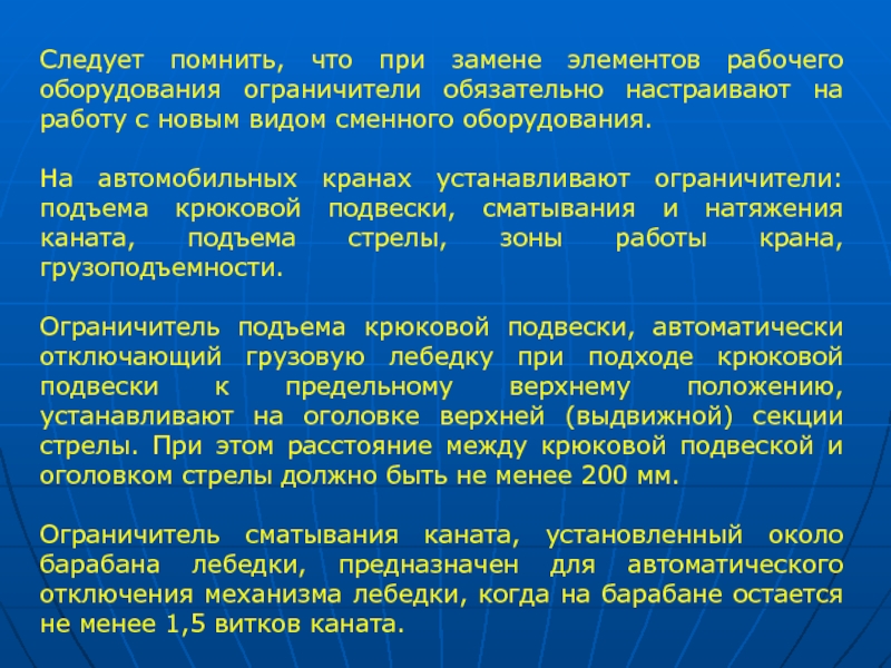 На автомобильных кранах устанавливают ограничители: подъема крюковой подвески, сматывания и натяжения каната, подъема стрелы, зоны работы крана, грузоподъемности.