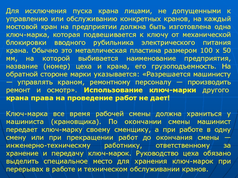 По окончании работ машинист (крановщик), обслуживающий несколько кранов, сдает ключ-марки не сменщику, а работнику, ответственному за хранение и передачу ключ-марок, например старшему дежурному инженеру-электрику своей смены, за исключением ключ-марки того крана, который закреплен за ним и который он сдает своему сменщику.