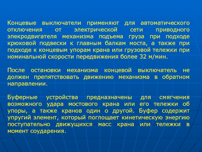 Слайд 3Концевые выключатели ограничителей рабочих движений должны включаться в электрическую схему крана