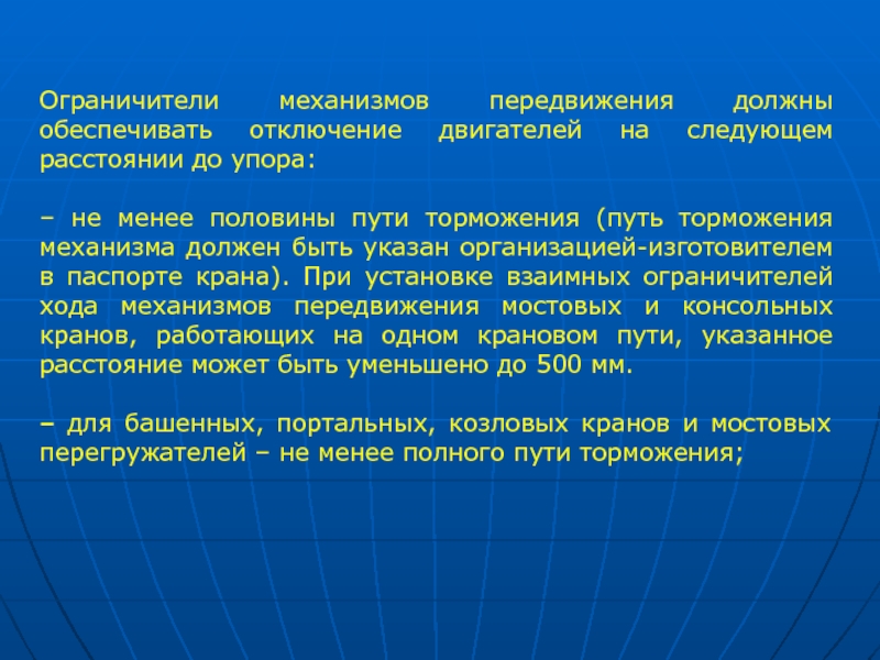 Слайд 4Ограничители механизмов передвижения должны обеспечивать отключение двигателей на следующем расстоянии до