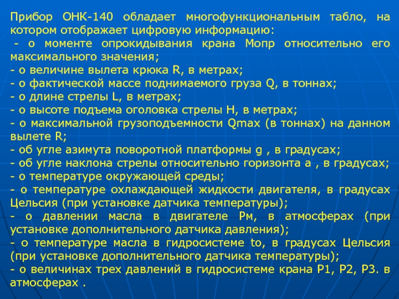 Слайд 37Ограничитель нагрузки крана ОНК-160С является многофункциональным прибором безопасности, который, в сочетании