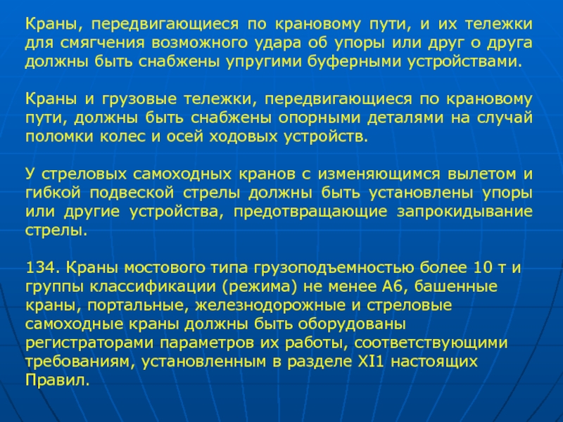 Слайд 9Краны, передвигающиеся по крановому пути, и их тележки для смягчения возможного