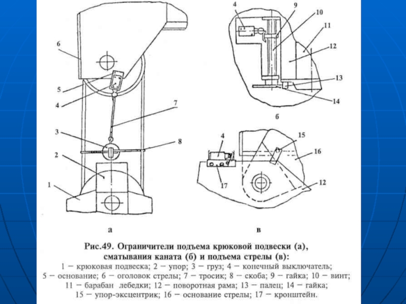 Слайд 26Ограничитель подъема стрелы, установленный на поворотной раме у основания стрелы, предназначен