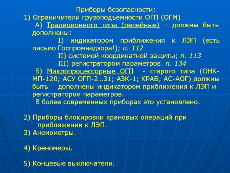 приборами и устройствами, обеспечивающими их безопасную эксплуатацию: ограничителями, указателями, сигнальными устройствами.