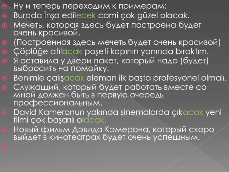 А это, напомню, конструкции типа: «Okuyan kadın», «oynayan çocuk», «duran araba» и так далее, то нынешняя тема не вызовет у вас особых вопросов. Если деепричастие an/en мы используем для прошлого и настоящего, то для переноса его в будущее мы как раз и будем употреблять деепричастие acak/ecek.