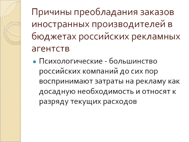 Слайд 10Причины преобладания заказов иностранных производителей в бюджетах российских рекламных агентств