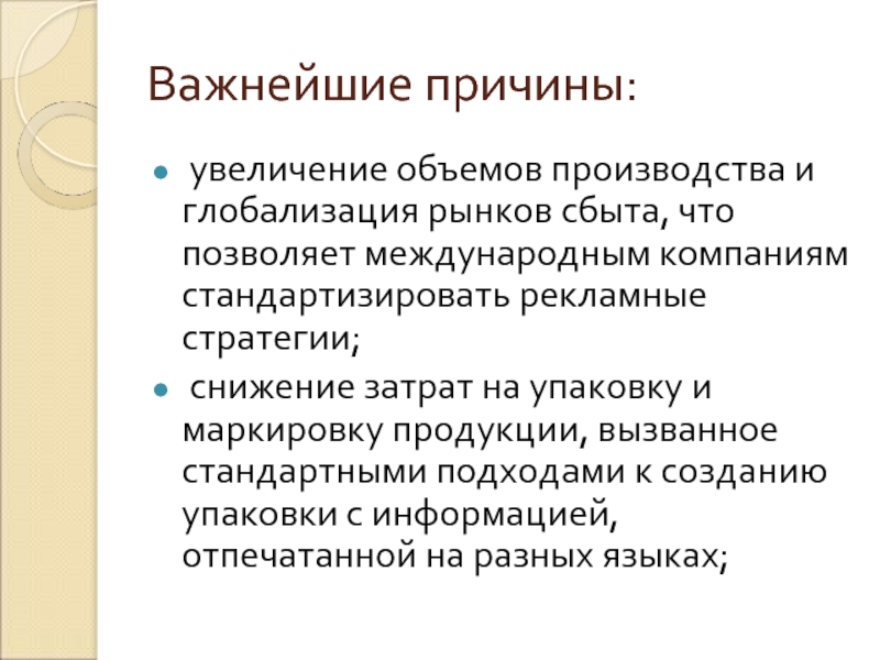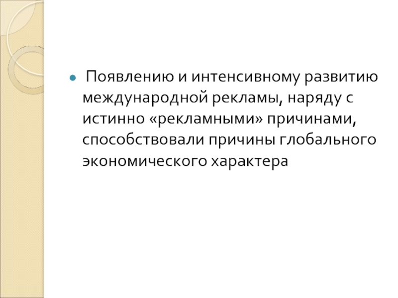 Слайд 13 Появлению и интенсивному развитию международной рекламы, наряду с истинно «рекламными» причинами,