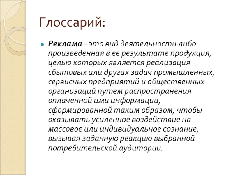 Реклама - это вид деятельности либо произведенная в ее результате продукция, целью