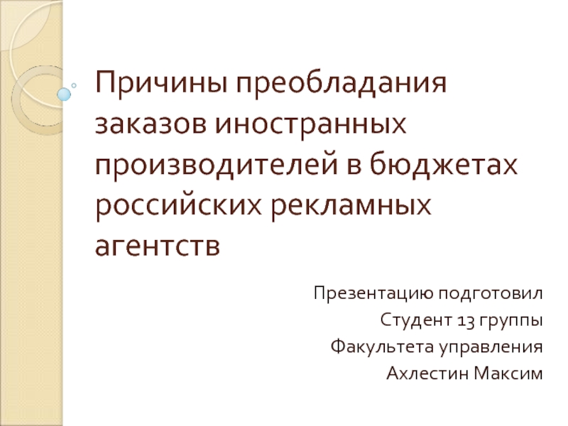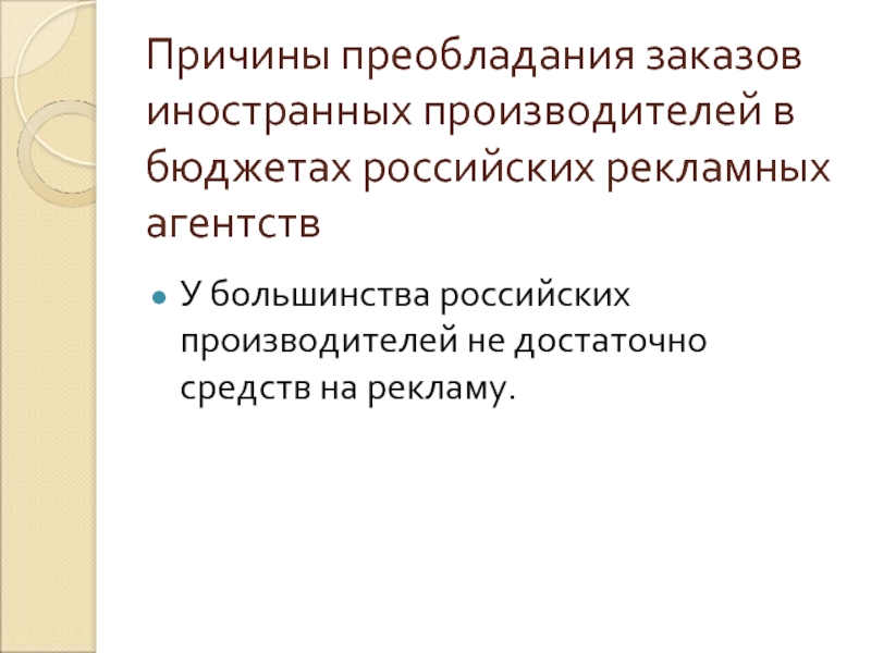 Причины преобладания заказов иностранных производителей в бюджетах российских рекламных агентств презентация