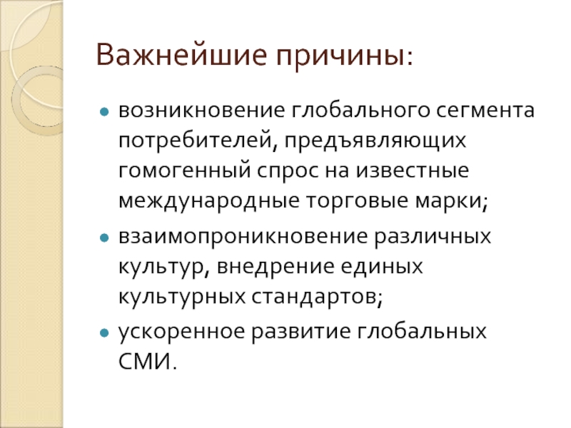 возникновение глобального сегмента потребителей, предъявляющих гомогенный спрос на известные международные