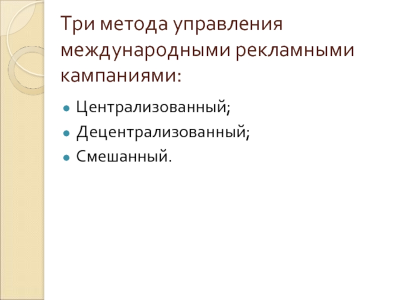 Слайд 5Три метода управления международными рекламными кампаниями: